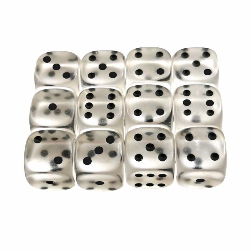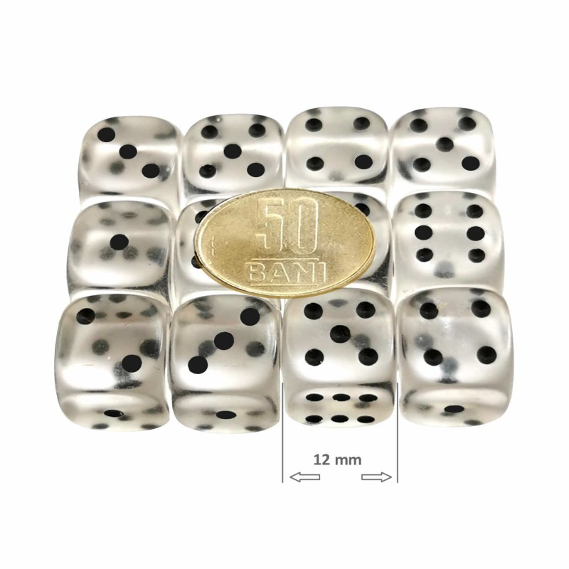 Va oferim un set de 12 zaruri transparente, cu latura de 12 mm, pentru jucat Yamms si alte jocuri de societate.