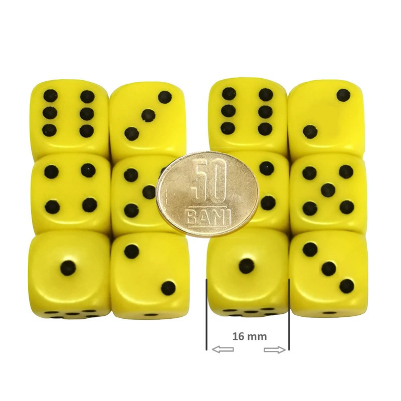 Va oferim un set de 12 zaruri galbene, cu latura de 16 mm, pentru jucat Yamms si alte jocuri de societate.